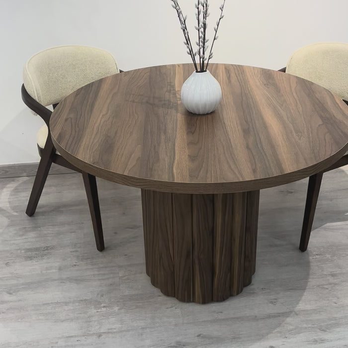 La table de repas ATHENA 110 Aspect Noyer séduit par sa présence sculpturale et son design intemporel.