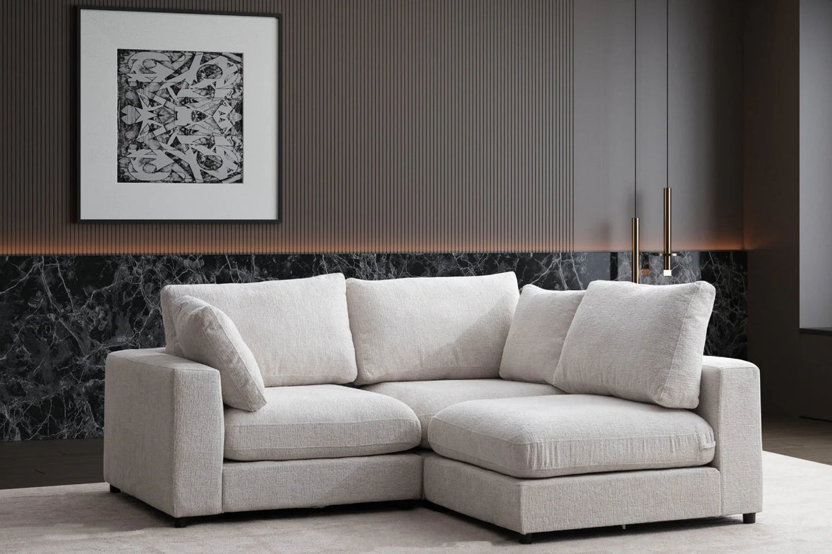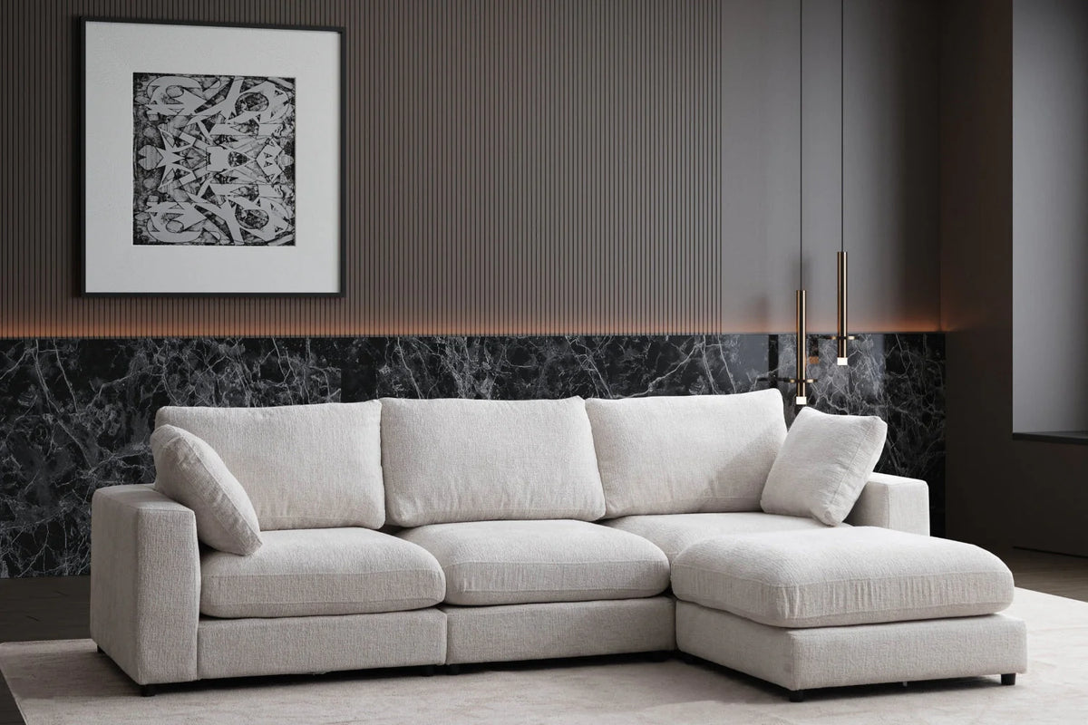 Découvrez notre canapé Julia 3+1 en tissu chenille Blanc cassé.
