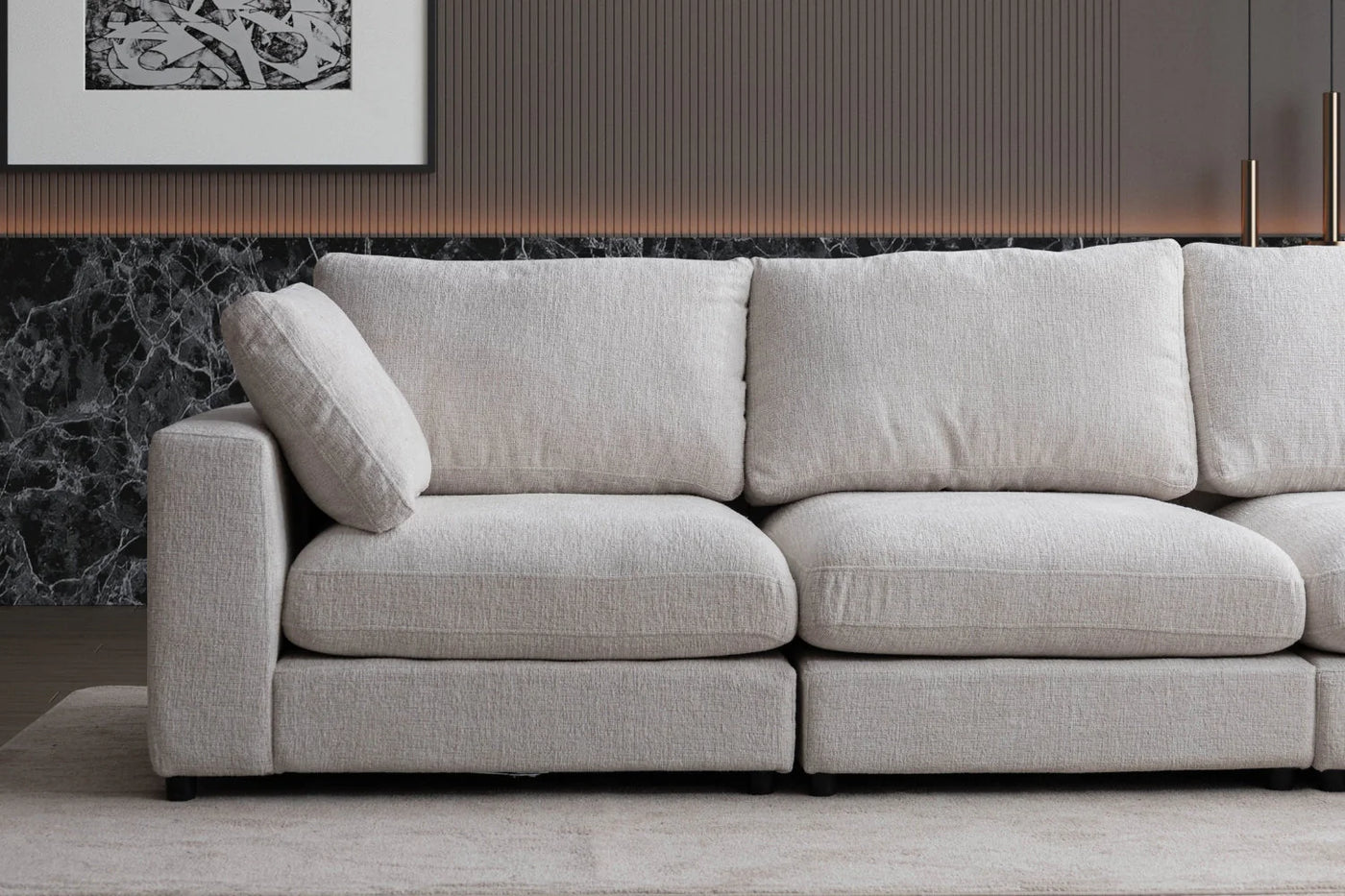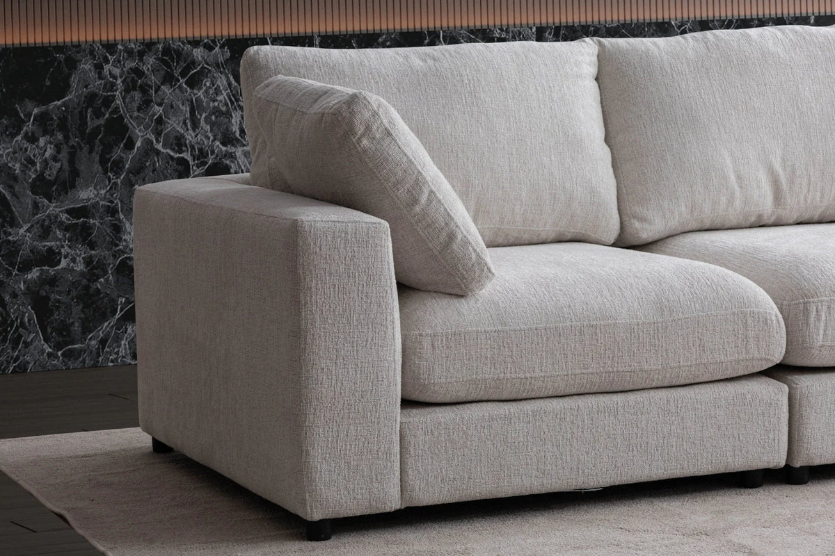 Habillé d'un tissu chenille doux et luxueux, il offre un toucher exceptionnel tout en apportant une élégance subtile à votre intérieur. Modulable, il permet de créer différentes configurations pour un espace de vie personnalisé.