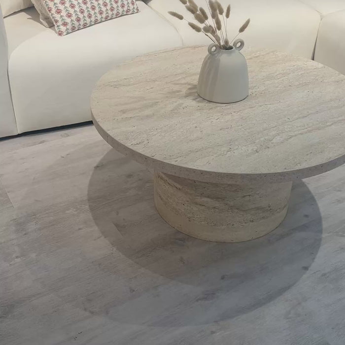 Table basse ronde effet tout travertin (Pied et plateau).