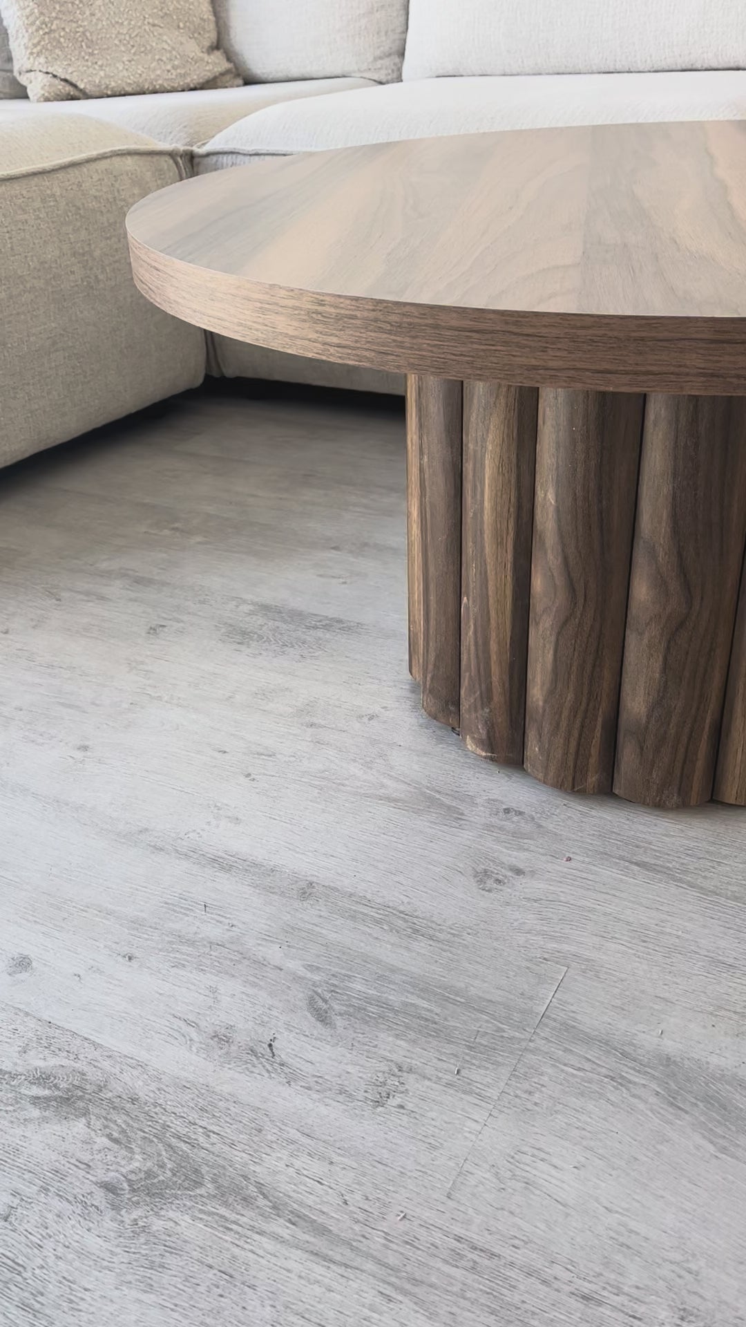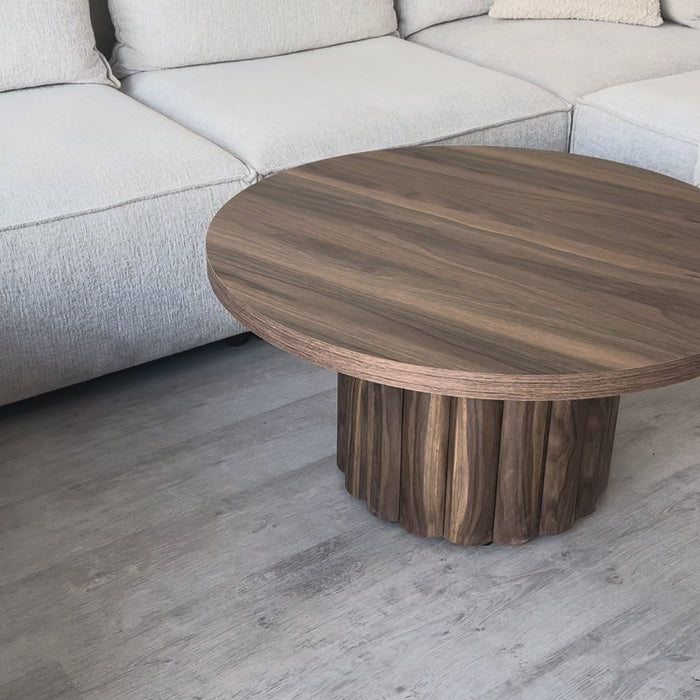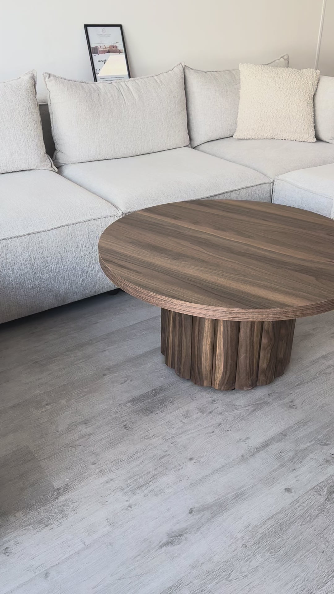 Avec son plateau rond en finition bois naturel et son pied cylindrique sculpté, elle combine esthétique organique et design architectural.