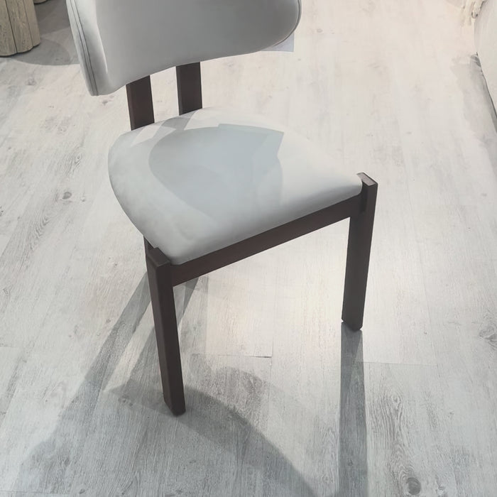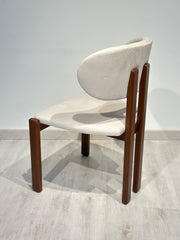 La chaise TANIA se distingue par son dosseret large et arrondi, offrant un soutien enveloppant et un confort remarquable. Son piètement en bois noyer, aux lignes droites et affirmées, crée un contraste subtil avec l’assise et le dossier rembourrés dans un tissu doux et lumineux.
