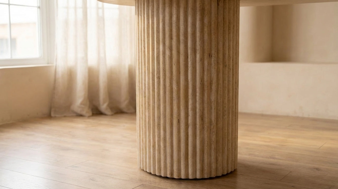 Son plateau à l’effet travertin révèle des nuances naturelles et raffinées, tandis que ses pieds cannelés, inspirés des colonnes antiques, apportent une dimension architecturale forte à l’ensemble.